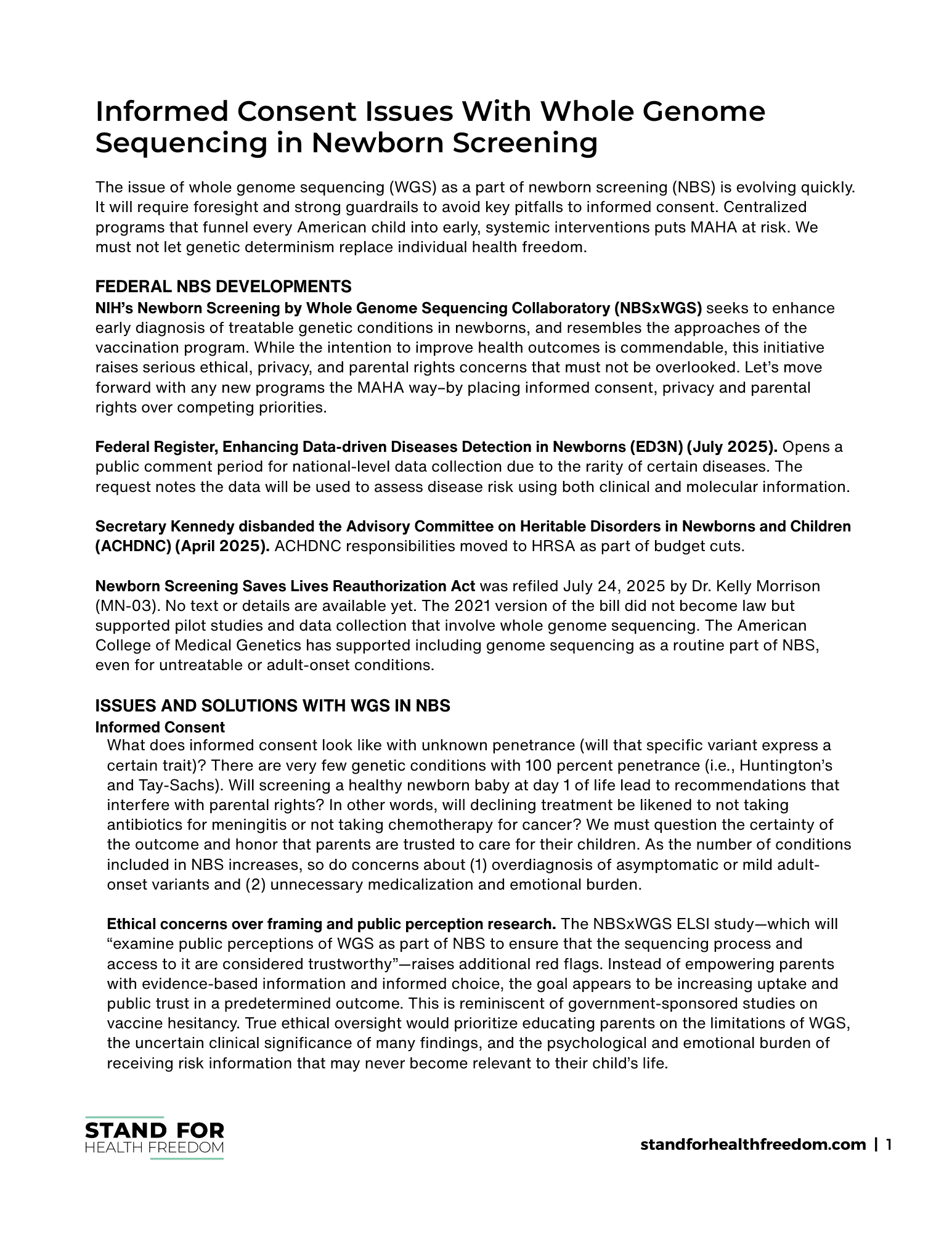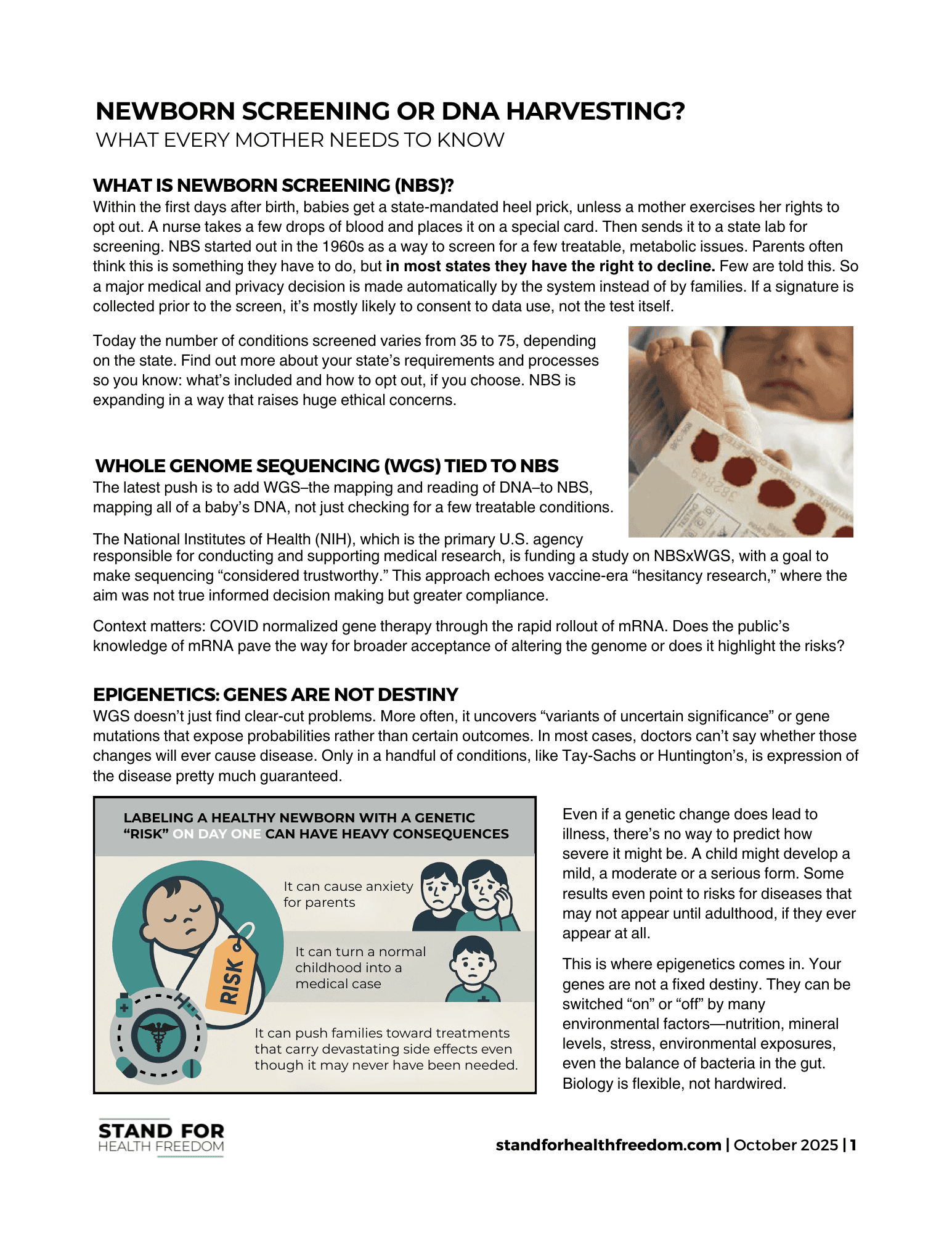 • Keep an eye on new laws and funding that would push DNA testing into routine newborn screening, and speak up early to stop it.