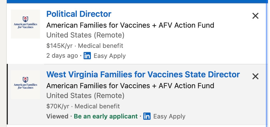 AFVโs LinkedIn job postings include a six-figure Political Director role and a salaried State Director position in West Virginia, both offering benefits.