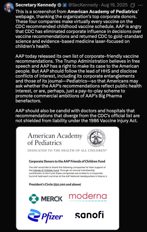 Kennedy also shed light on the significant conflicts of interest of ACIP non-voting liaison representative, the American Academy of Pediatrics (AAP), one of the harshest critics of the changes taking place on the committee. As a long standing liaison to ACIP, the AAP helped shape vaccine approvals and recommendations for decades – recommendations that, while technically advisory, are embedded in โnearly 600 statutes and regulations across 49 states, three territories, and Washington, D.C.โ At the same time, the AAP received substantial financial support from vaccine manufacturers whose products are directly affected by ACIP recommendations, creating a feedback loop that benefits both AAP members (pediatricians) and their corporate sponsors.