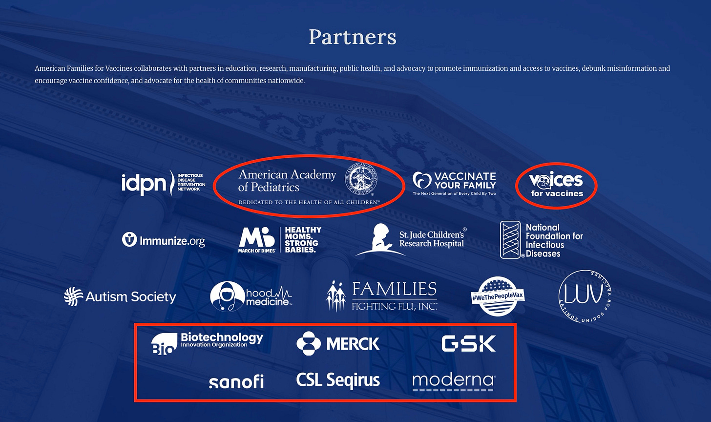 The American Families for Vaccinesโ corporate partnerships include the American Academy of Pediatrics, vaccine manufacturersโMerck, GlaxoSmithKline, Moderna, Sanofiโas well as, Biotechnology Innovation Organization, aka BIO, another ACIP non-voting liaison member and an organization known to testify in state houses in opposition to bills that would provide vaccine transparency.