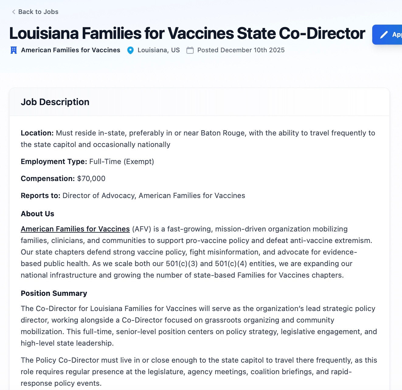 American Families for Vaccines (AFV) lists the AAP as one of its corporate โpartners.โ The organizationโs expanding network of affiliate state chapters actively promotes pro-vaccine legislation and the removal or restriction of religious exemptions from vaccine mandates – a shared policy position with AAP. In 2025, AFV expanded its organizational structure to include a 501(c)(4) Action Fund, enabling the organization to engage directly in legislative advocacy. They anticipate being in 30 states by the end of 2026. Their stated goal is โto unite families, health experts, lawmakers, and partners under one banner.โ